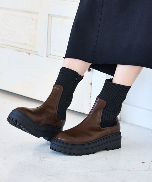 レザー×リブニットの異素材コンビデザインのブーツ。トレンド感のあるボリュームソールで存在感抜群です。
