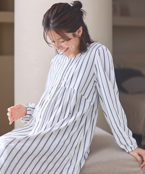 マタニティ 接結ダブルガーゼ無地・ストライプネグリジェ/ワンピースパジャマ/ルームウェア(マタニティ/授乳服)授乳楽々 妊婦服 産前・産後対応