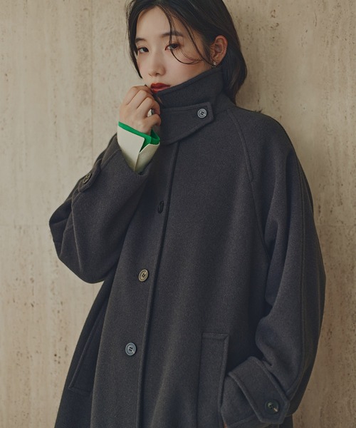 前ボタンが1列に並んだシングル仕様のステンカラーロングコート。