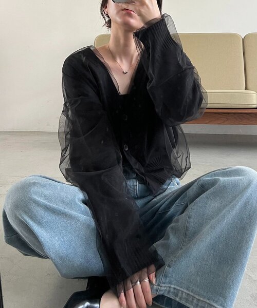 ・前立てや袖口などもチュールに覆われ、ニット部分が見えないことでモード感のある1枚に