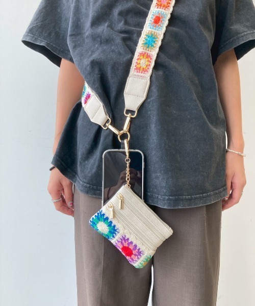 【 クロシェ編み ポーチ付き ショルダーストラップ スマホストラップ 】