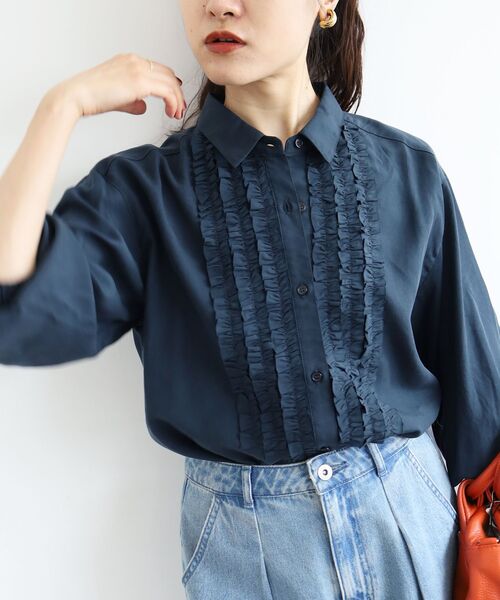 襟やカフスなどシャツ型にしていることで甘すぎず、フリルの端を切りっぱなしにして軽くラフに仕上げることで、程よいカジュアルさをプラスしフリルでも甘くなりすぎず、大人が取り入れやすいデザインになっています。