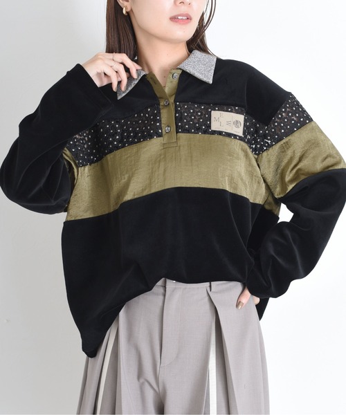 コットンポリエステルのマシュマロタッチベロアに刺繍レースやナイロンサテンを組み合わせた存在感あるレディなポロシャツ。