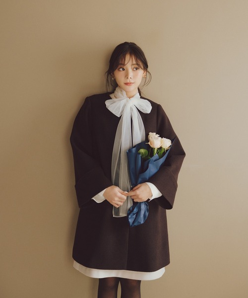 昨年人気だったコートを、よりフォルムが出る素敵な素材にアップデート!お尻が隠れるくらいのAラインシルエットが上品なコートです。女性らしい印象に見せてくれるワイドな袖口がポイントで、ボリュームのあるニットなども合わせやすい仕上がりに。襟元はノーカラーでミニマルなためマフラーなど首まわりの小物とも好相性。フロントはスナップ釦のダブル仕様が品よく、シンプルでどんなアイテムとも合わせやすいデザインです。