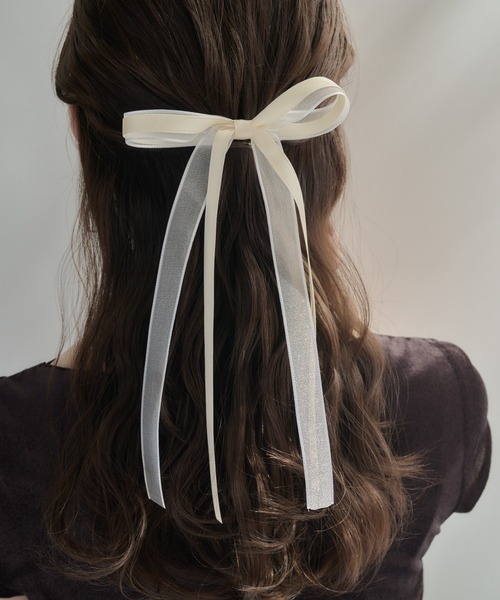 繊細な光沢のあるリボンが長く垂れ下がり、動くたびに揺れて女性らしさを引き立てます。シンプルなヘアスタイルも、一瞬で華やかに格上げします。