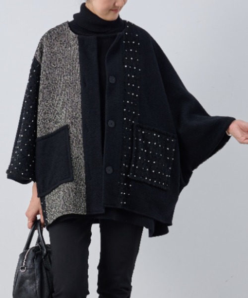 異素材ミックスで魅せる、パッチワークデザインのポンチョコート。