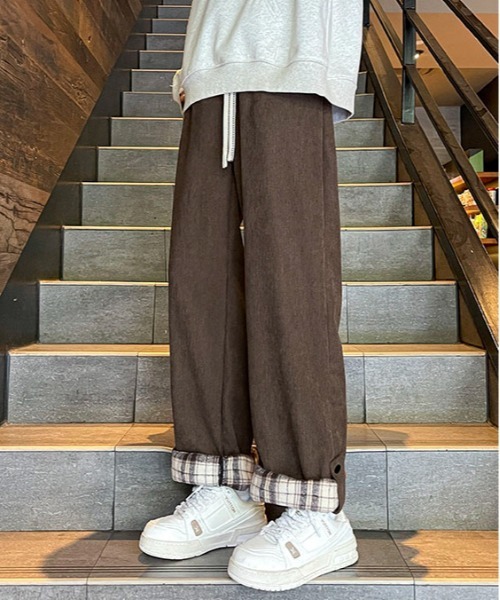 ゆったりとしたシルエットと、裾から覗くチェック柄が、着こなしに程よいアクセントを加えてくれます。