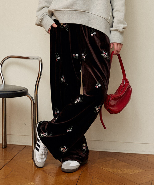 レトロな花刺繍とベロア生地の組み合わせがレトロ可愛いリラックスパンツ