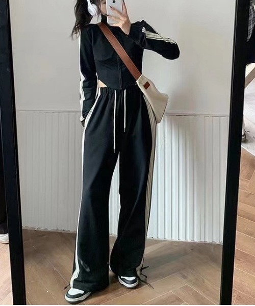 ■DETAILスポーティ×トレンドが融合したクロップド丈ジャケットとラインパンツのセットアップ。