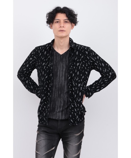 金属のような艶を帯びたクロヒョウ柄を、フロッキーと箔調プリントの重ね技で表現。