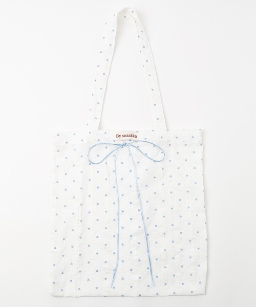 凹凸感のあるハートドット柄プリント生地とリボンを組み合わせたガーリーなトートバッグ。