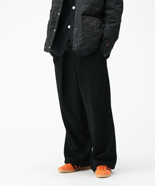 カシミヤMIXのウールフランネル素材を使用した、2プリーツワイドスラックス。腰まわりのボリュームを出す2プリーツ仕様に加え、センタークリースを施すことでスラックスらしい端正な表情に仕上げています。