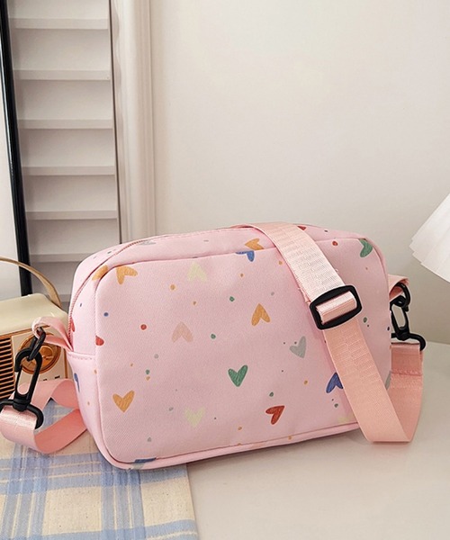 淡い色味にカラフルなハート柄が散りばめられたキュートなバッグ。