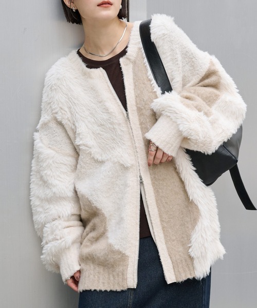 3種類の異素材がミックスされたふわもこニットのダブルジップカーディガン。
