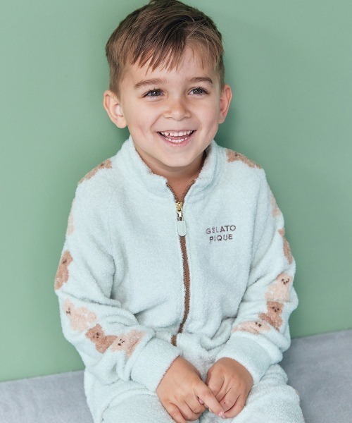 トレンドのスポーツテイストを旬のカラーリングで表現したシリーズ。袖にライン状のジャガード柄を入れた、キャッチーな存在感のトラックジャケットです。汗を素早く吸う吸水機能を備えているので、暑さが残りやすい秋の羽織りに最適な素材感。ジャガード柄は色ごとに異なる絵柄になっています。左胸のロゴ刺繍とファスナーの配色でアクセントを効かせました。色はベア柄のミント、フラワー柄のラベンダー、スター柄のブルーの3色展開。同シリーズのトラックパンツや同時期に展開するペイント柄カットソーシリーズを合わせたり、BABYアイテムとのリンクコーディネートもお楽しみいただけます。