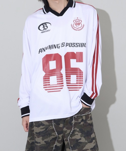 トレンド感のあるビッグシルエットに、袖のサイドラインやチームロゴを思わせるグラフィックを施し、
