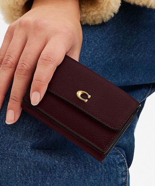 コンパクトなデザインながら整理整頓がしやすい三つ折り財布。ポリッシュド ペブル レザーに、コーチの“C”のハードウェアがアクセントを添えます。