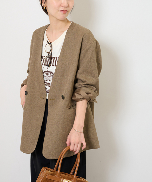 ノーカラーで衿元はすっきり仕上げ、ゆとりのあるシルエットでかっちりしすぎず着用いただけます。