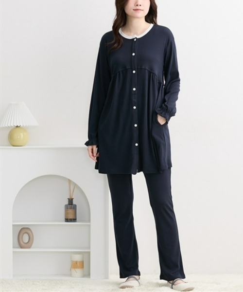 衿配色とふんわりしたギャザーがかわいい、長袖マタニティパジャマです。