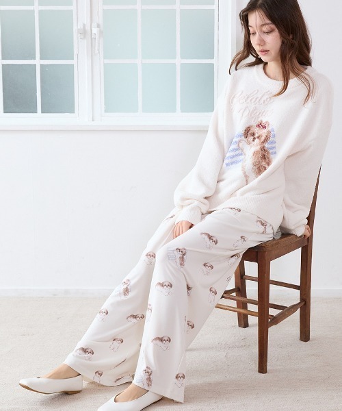 お気に入りの枕に寄り添う、リボンを付けたシーズー犬を描いたカットソーシリーズです。枕元でリラックスしたり、つぶらな瞳でこちらを見ていたり、色々な表情のシーズーを総柄プリントしたロングパンツ。タックインして着こなしやすいフリル付きのウエストで、両脇と右ヒップにはポケットが付いています。同シリーズのパンツや雑貨、同時期に展開するシーズーのニットプルオーバーと合わせてお楽しみください。