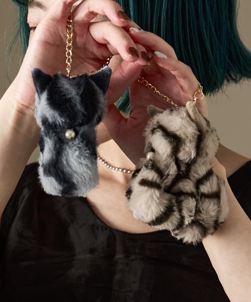 チャーム パール付きファー猫チャーム グローブホルダー レディース
