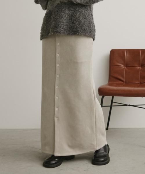 フロントボタンがアクセントのナロースカート。