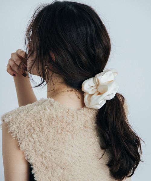 ・光沢感のあるサテン素材が、髪に華やかなアクセントを添えるシュシュ。