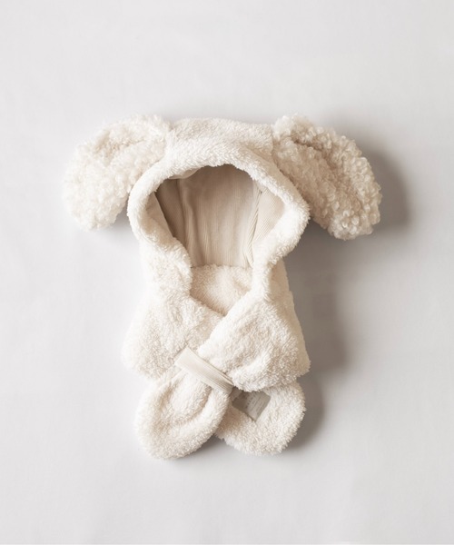 モコモコの生地で、ベビーの頭をすっぽり包むフード付きマフラーです。