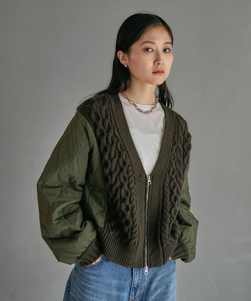 トレンド感のあるニットとキルトを使用した異素材のカーディガン