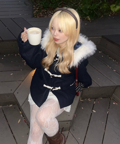・フェイクファーがついたフードが可愛いダッフルコート。