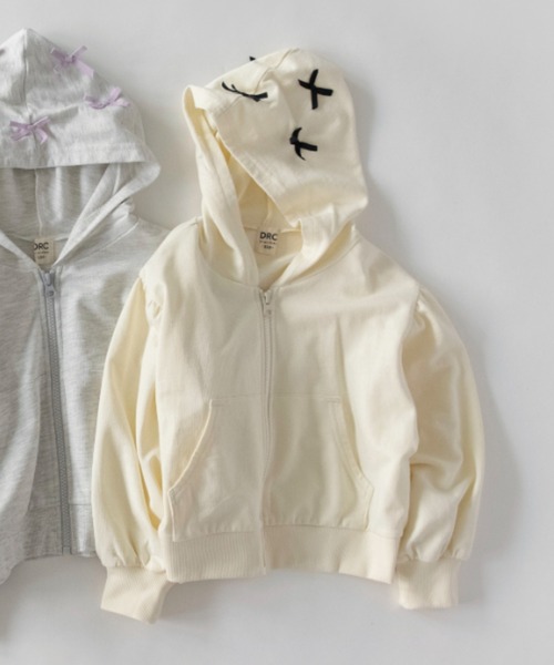 フードにたくさんリボンが付いたパーカーは
