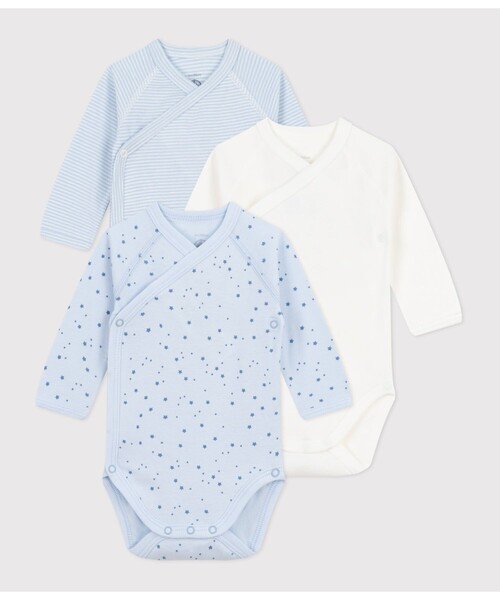 ミラレボーダー×星柄×プレーンカラー、ハート柄×ブランドロゴ×プレーンカラーの組み合わせで揃えた長袖あわせボディ3枚セットです。環境にやさしく、第二の肌と呼ばれるほど心地よい肌触りの1x1リブ編みコットンを使用し、快適かつナチュラルな着心地を実現しています。お着替えがしやすいよう、スナップボタンが施されているので外出時も安心。何枚あっても嬉しいアイテムは、出産祝いなどのギフトにもおすすめです。※プリントは永久的なものではなく、もみや摩擦でひび割れたり、繰り返しの洗濯によるプリントの変色や、脱落が生じる場合があります。中性洗剤などで単独洗いをしてください。