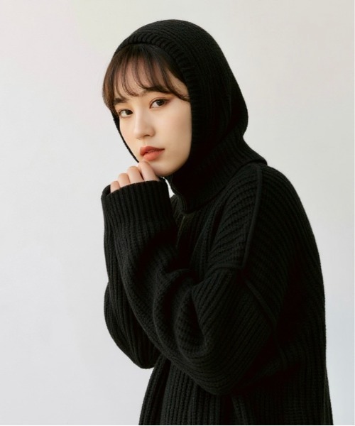 顔まわりをすっぽりと包み込む、フードのようなデザインが印象的なニットフードウォーマー