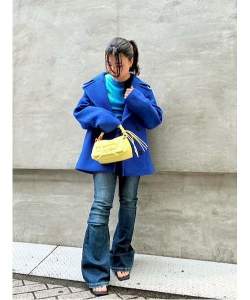 ふっくらとした素材で仕立てられた、ショート丈のダブルブレストコート。