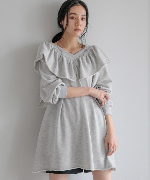 衿まわりの大きめなフリルがポイントの裏毛ミニワンピース。