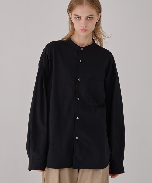 襟周りは、きれいめでクリーン印象のバンドカラーで仕上げ、ゆったりとした身幅やアームホールなど、リラックス感溢れるオーバーサイズにアレンジしました。