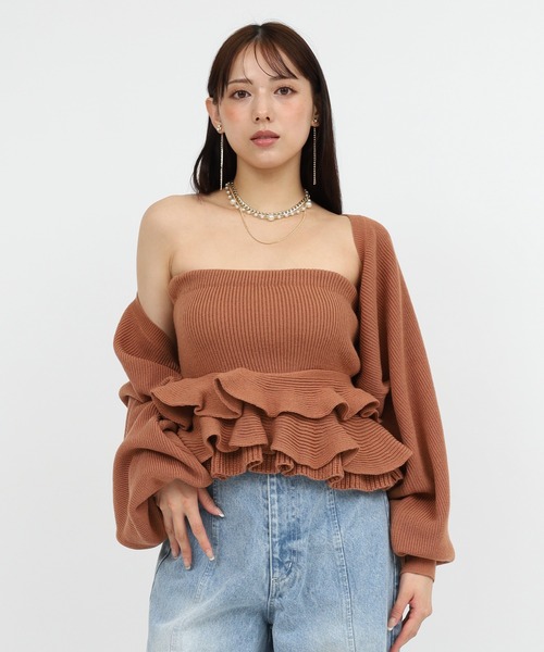 フェミニンなムードが際立つニットベアトップと畦編みニットボレロのアンサンブルセット。