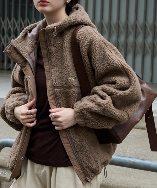 ■ワンポイント刺繍がアクセントになったフーディーボアアウター。