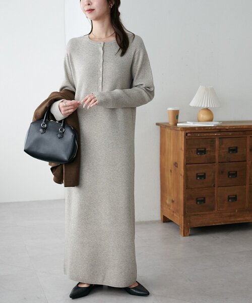 シンプルの中におしゃれさも兼ね備えたニットワンピース。・女性らしさを引き立てるヘンリーネックデザインがポイントのワンピース