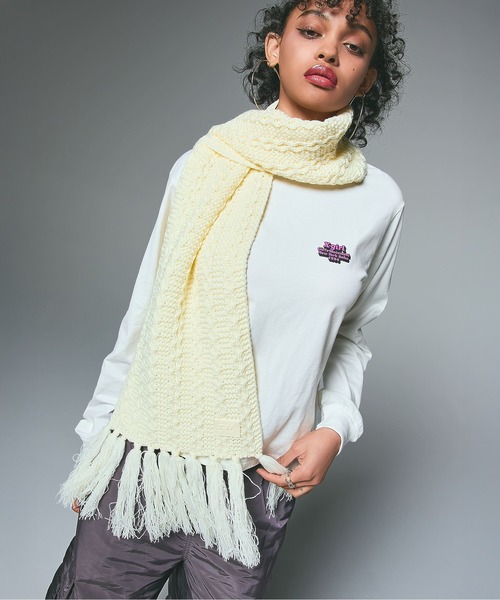 立体感のある編み地と、両端のフリンジが魅力。