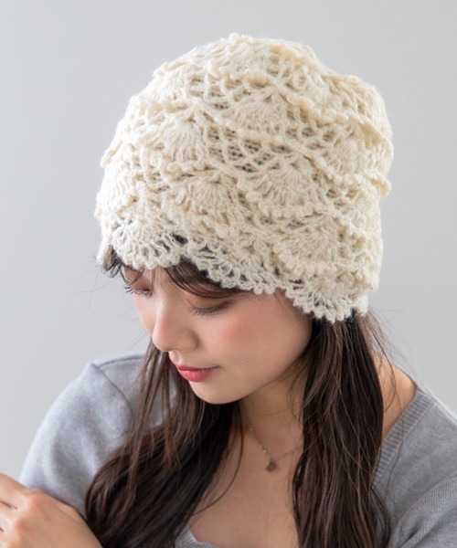 ふんわり柔らかな糸で編み上げた、レトロ感のあるクロシェ風ニット帽。