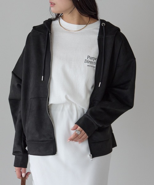 ふっくらとしたポンチ生地のスエードライクな起毛感とさりげない光沢が魅力。カジュアルすぎず大人っぽく仕上がります。