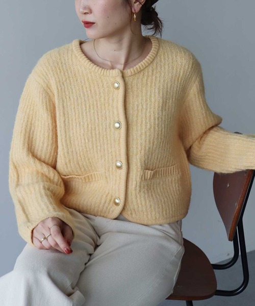フロントのゴールドボタンがクラシカルなイメージのニットカーディガン。