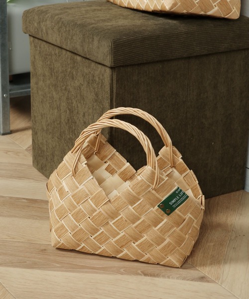 柳素材の持ち手×コットンウッドのスライス材とペーパーを重ねて格子状に編んだバスケット。