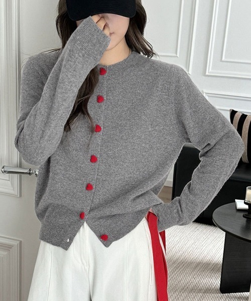 フロントのレッドハートボタンが視線を集める、ガーリー感たっぷりのカーディガン。