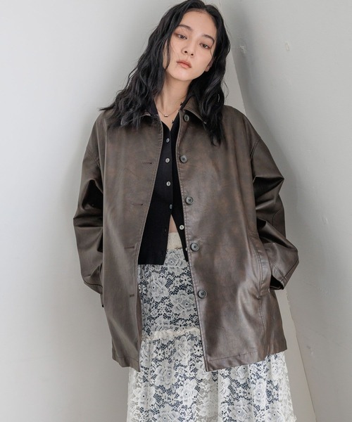 カジュアルなデザインが魅力のカバーオールを、秋らしくフェイクレザーで仕上げました。