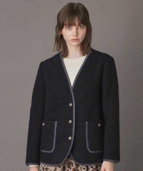 配色のトリミングとメタル釦がポイントになっていてトラッドな印象に。