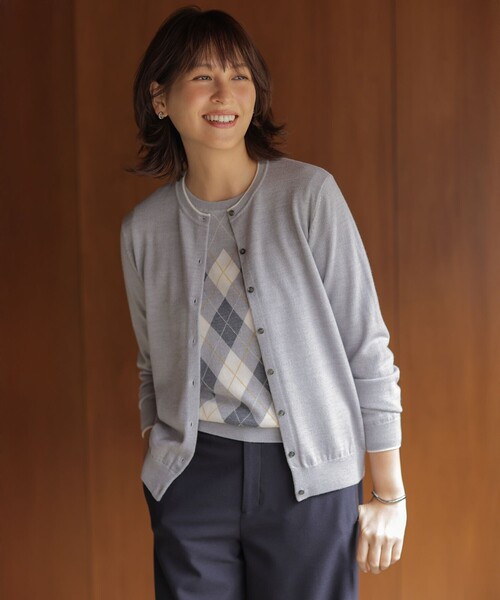 無地のカーディガンとアーガイル柄のインナーを組み合わせた、定番のツインニット。カーディガンには本貝釦をあしらい、襟と袖口にさりげない配色ラインを入れることで、単品でも着映えするデザインにしました。インナーはクラシカルなアーガイル柄に、胸元から無地の切替を取り入れ、すっきりとした印象に。トラッド感のある雰囲気に女性らしさをプラスした、通勤からお出かけまで幅広く活躍するアイテムです。カラーは、上品で落ち着いた印象のグレー(#003)、優しさと温かさの感じられるベージュ(#033)、顔周りを明るく見せるソフトブルー(#072)の3色展開です。