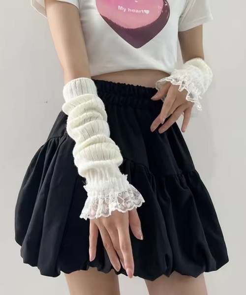 ふんわりとしたリブ編みニットに、裾のレースフリルをプラスしたガーリーなアームカバー。