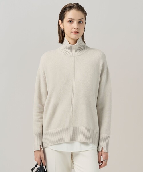 リラクシーシルエットのハイネックプルオーバーです。きれいに立ち上がるネック、袖の長めのリブなど、すっきり見えするサイズ感やバランスに拘っています。また、前後身頃中心に編みテクニックのラインでポイントを入れ、袖口はスリットでエッジをプラスしました。単品はもちろん、インナーにシンプルジャージーロングスリーブTシャツやシャツをレイヤードしていただくのもおすすめです。アウターを羽織ってももたつかず、暖かく上品に着こなせる究極のニットプルオーバーです。